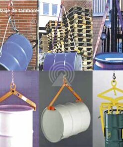 Eslingas con ganchos para el transporte de tambores con tapa y borde en posición vertical y horizontal.